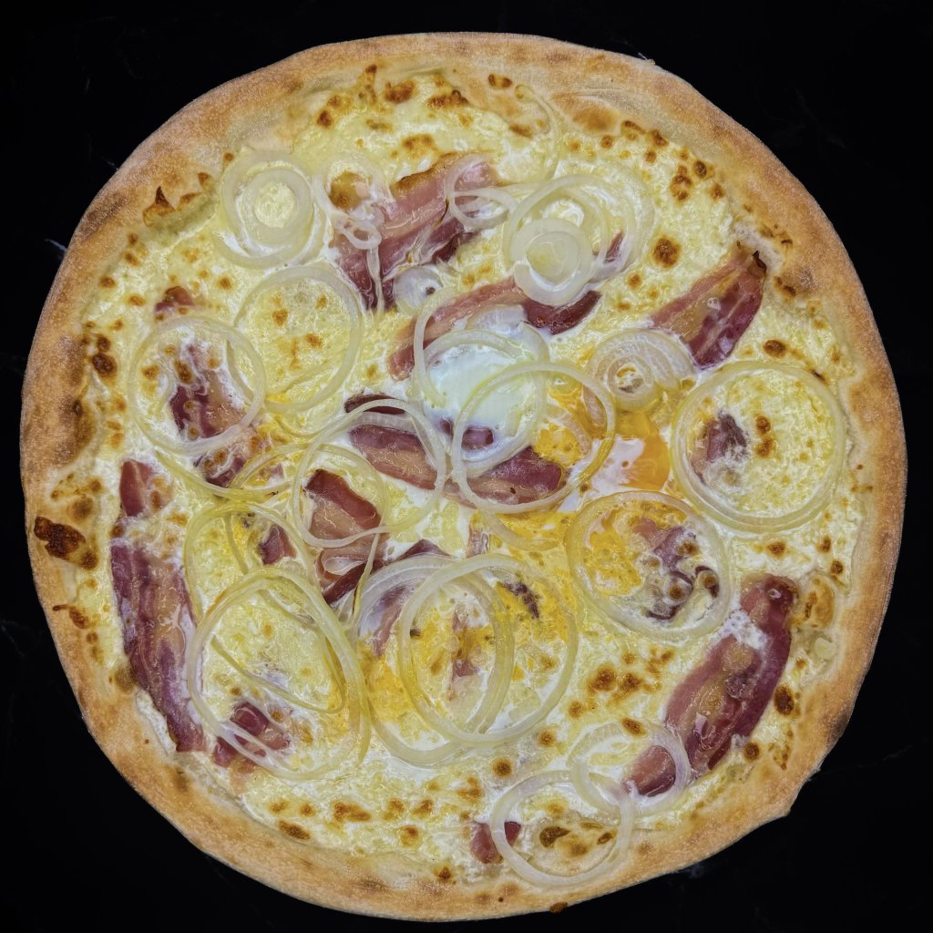 smetana, mozzarela, pancetta, cibule, vejce, parmezán, oregano