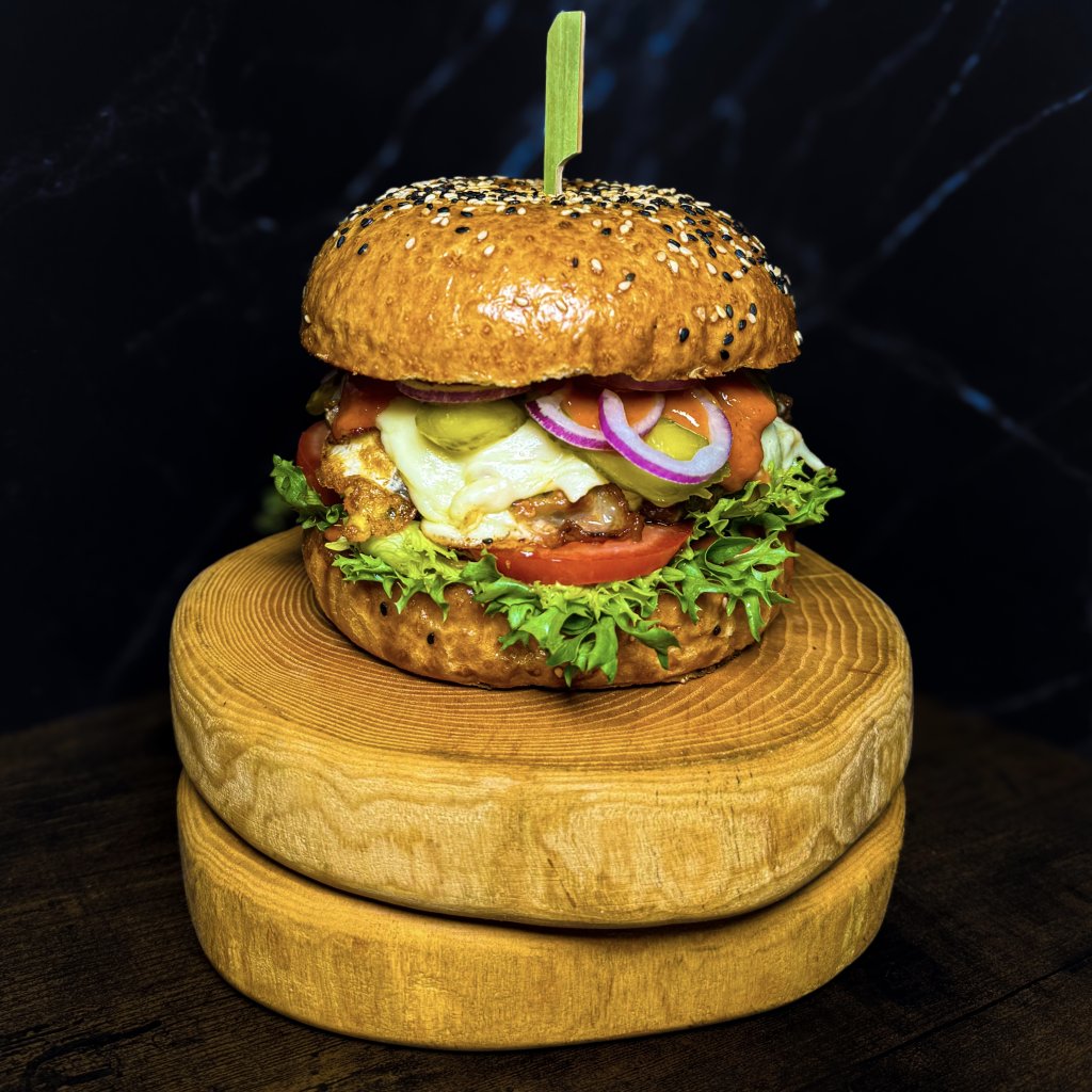 Domácí houska ,hovězí maso, pancetta, gouda, vejce, zelenina, domácí dresink.
